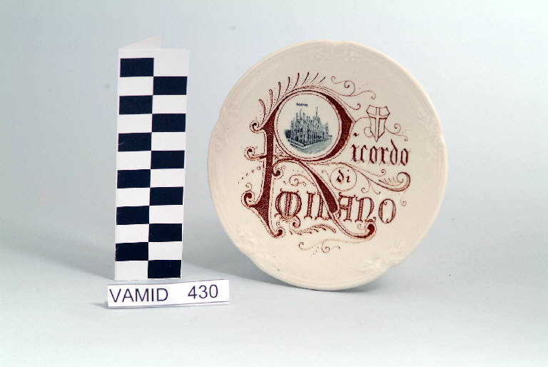 - NOTIZIE STORICO CRITICHE Il piatto-souvernir, prodotto in serie e decorato a stampa con transfer sottosmalto, fa parte di una gruppo di piatti con diversi monumenti di Milano, raffigurati all'interno della lettera "R". Il Museo ne possiede altri esemplari (nn. inv. 429, 431-433, 2401). La tecnica a stampa si basa sull'incisione di una matrice in rame eseguita per lo più a bulino. La lastra viene passata allo stampatore che la spalma a caldo con una miscela di colore e altro che è poi compressa nei solchi dell'incisione con un tampone. Pulita la lastra con stracci di lino, la si imprime con il torchio su una carta speciale, la "carta di riso". La carta di riso stampata viene poi applicata (solitamente da mani femminili con pinzette, spignette intrise d'acqua e altro) e premuta con un rullo di panno sul pezzo ceramico. Si procede poi allo stacco della carta con una spugna bagnata oppure per immersione in acqua. L'oggetto è quindi pronto per essere sottoposto ai normali processi di cottura ceramica.