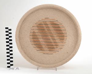 Piatto circolare con bordo rialzato con motivo intarsiato al centro del cavetto.