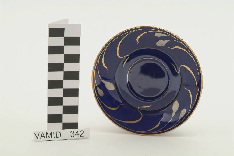 Piattino circolare decorato con disegni floreali (iris) in argento e oro su fondo blu cobalto; bordo rifinito con filettatura oro.