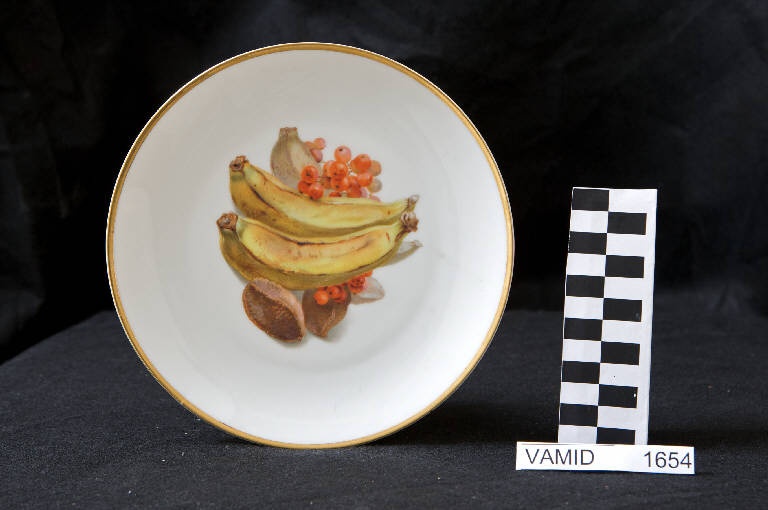 Piatto da frutta circolare; fondo bianco con banane, ribes e mandorle brasiliane in giallo, rosso, verde e marrone nel centro del cavetto; bordo rifinito con filettatura oro.