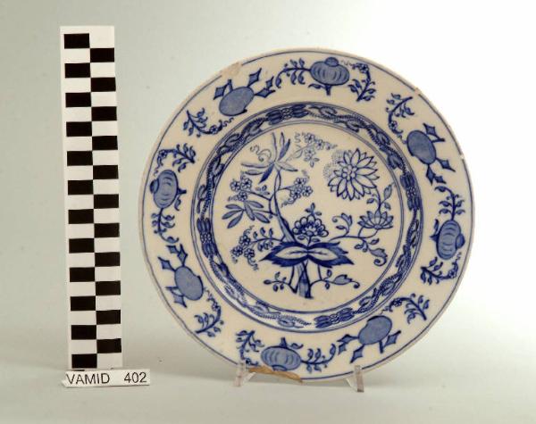 - NOTIZIE STORICO CRITICHE Il piatto piano in esame è decorato a transfer sottosmalto con un motivo bu cobalto denominato "Meissen". Tipologicamente si lega ad un altro piatto prodotto dalla S.C.I. (nun. inv. 401) e ad un servizio da tavola (nn. inv. 656-657) realizzato dalla Richard Ginori. L'ornato venne spesso utilizzato anche dallo stesso Andlovitz. Le ultime due cifre ("24") presenti nel marchio impresso a tergo, come riporta anche Raffaella Ausenda nel suo libro (cfr "Storia della ceramica nel territorio di Varese dal '700 al '900", 2007, p. 37), riguardano la datazione del corpo ceramico e quindi un sicuro termine post quem.