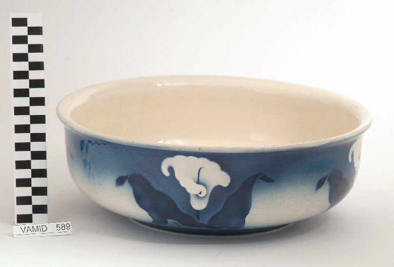 Catino lavamano con piede circolare; bordo leggermente estroflesso: fondo bianco decorato in smalto blu e motivo floreale (calle) all'esterno; bianco internamente.