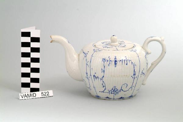 Teiera di colore bianco con corpo globulare; manico a "C"; beccuccio sporgente. Decorazione con motivi geometrici (linee rette, curve, arricciate) e vegetali (fiori a sei petali) in blu.