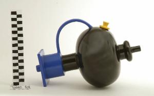 Teiera a forma di trottola con manico, beccuccio e apertura per introdurre il liquido chiusa da un tappo di colore giallo, nero e blu.