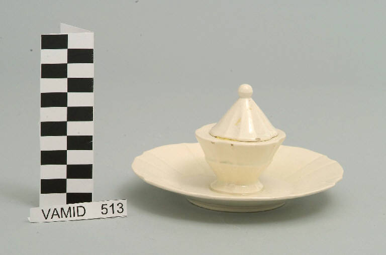 Salsiera con piattino attaccato; coperchio con pomolo apicale; fondo color avorio.
