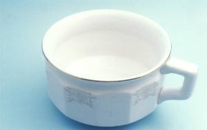 Pitale con piede circolare; manico squadrato; bordo leggermente estroflesso; fondo bianco con decorazione vegetale stilizzata in oro all'esterno; bordo rifinito con filettatura oro.