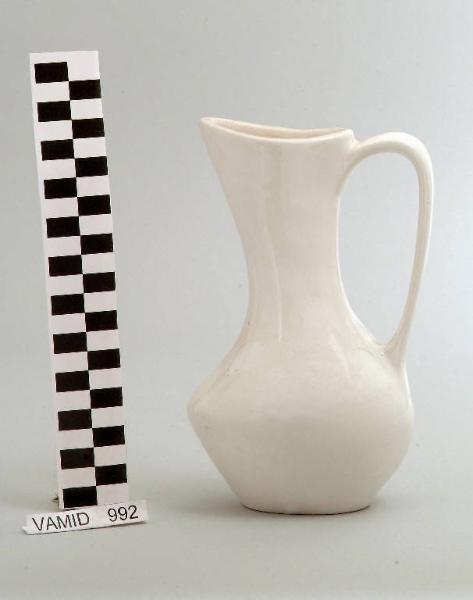 Brocca con corpo globulare; strozzatura in prossimità del collo terminante in un beccuccio; manico liscio; fondo bianco uniforme.
