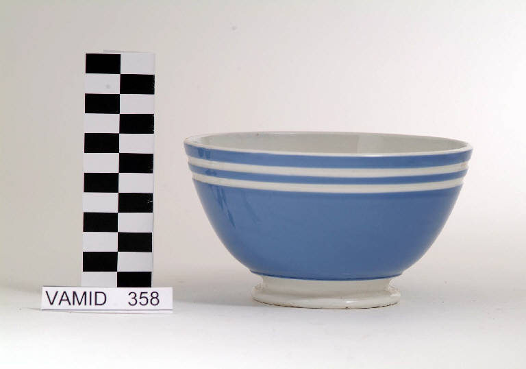 Ciotola con piede circolare; fondo azzurro con striscie bianche; bianco internamente.