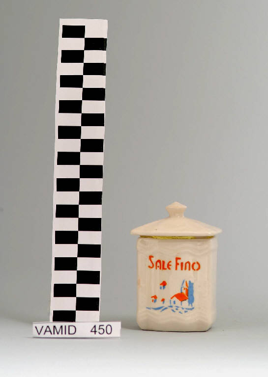 Barattolo a sezione quadrata con coperchio; fondo bianco avorio decorato su un lato con paesaggio con chiesa in azzurro e arancio; scritta "SALE FINO" in arancio.