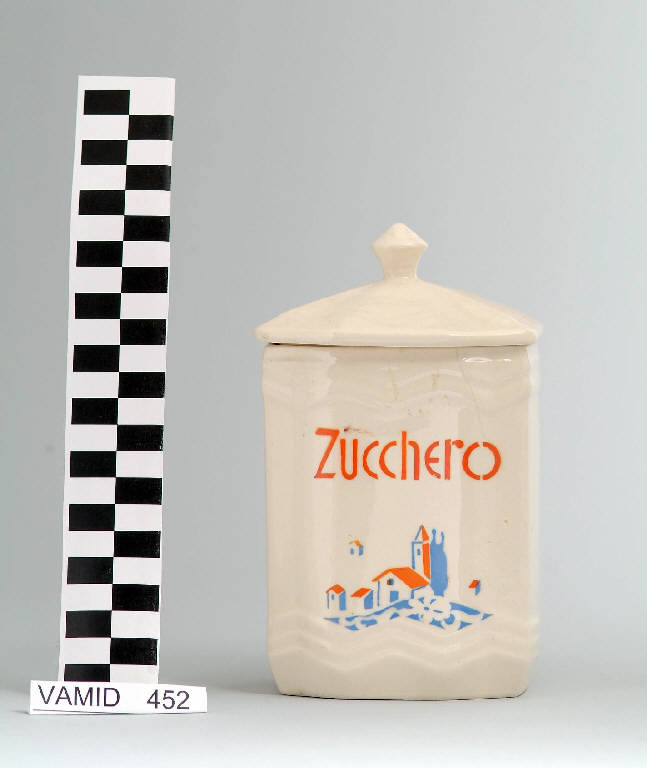 Barattolo a sezione quadrata con coperchio; fondo bianco avorio decorato su un lato con paesaggio con chiesa in azzurro e arancio; scritta "Zucchero" in arancio.