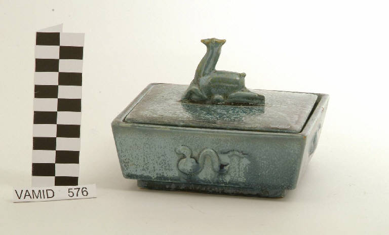 Scatola a sezione quadrata con animali marini a rilievo sui lati; coperchio quadrato con presa apicale a forma di cervo; fondo color grigio-verde sfumato.