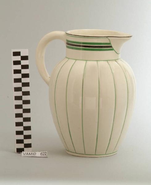 Brocca con corpo ovoidale baccellato; manico liscio; beccuccio sporgente; fondo color avorio con scanalature e profili rifiniti in nero e verde.