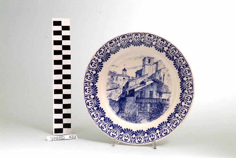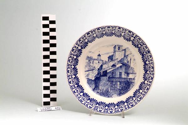 Piatto circolare; fondo bianco con veduta di paese in blu al centro del cavetto e motivi decorativi vegetali stilizzati in blu lungo l'ala.