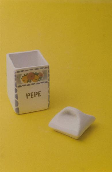 Barattolo portapepe a forma di parallelepipedo con coperchio leggermente piramidale e piccolo manico apicale; fondo bianco con decoro policromo a motivi geometrici e piccoli frutti e scritta "PEPE" in nero solo su una faccia.