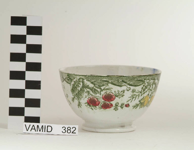 Ciotola con piede leggermente estroflesso, decoro a transfer in verde con motivo a rami intrecciati su controfondo retinato, da cui si dipartono tralci di foglie e fiori dipinti in rosso e giallo sottovernice.