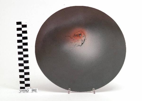 Scultura a forma di disco perfettamente piatto di colore grigio opaco con elementi a rilievo colorati in rosso, bianco e marrone mediante ossidi e sali.