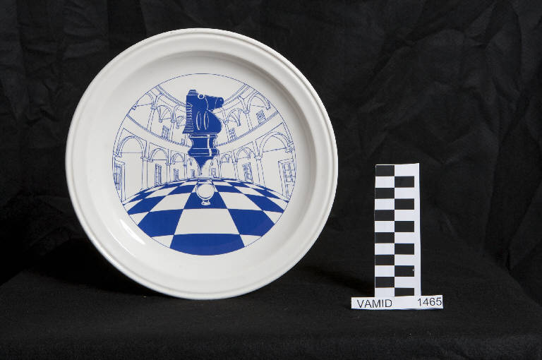 Piatto piano con piccola tesa solcata lungo il perimetro da una scanalatura. Decoro con una veduta del Palazzo perabò a cerro e un cavallo del gioco degli scacchi.