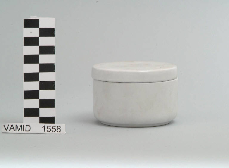 Contenitore cilindrico di colore bianco con coperchio liscio, da inserire su su base di legno di colore nero.