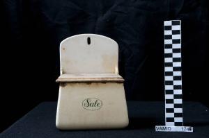 Contenitore portasale da parete di forma trapezoidale con coperchio incernierato e alzata retrostante per il fissaggio a parete; superficie retrostante in legno; colore bianco con scritta in blu..