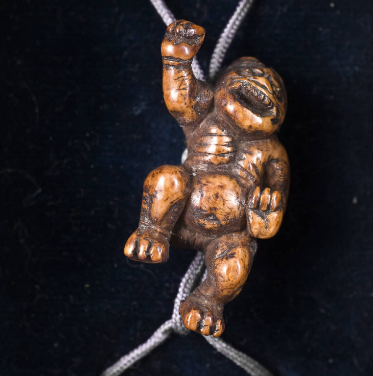 Raffigura un oni; sulle spalle tiene una fiasca a forma di zucca (hyotan) e la borsa da tabacco (tonkotsu) con ojime e netsuke di tipo manju.