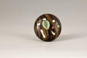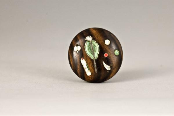 Netsuke di tipo manju in legno decorato a intarsi di madreperla e vetri colorati, sul quale sono raffigurati alcuni simboli di buon auspicio tra quelli insieme noti come takaramono, "oggetti preziosi": il ventaglio (uchiwa), il rotolo dipinto (makimono), il corno di rinoceronte. Nell'arte giapponese questi simboli sono spesso associati con i Sette Dei della Fortuna (shichifukujin) e la loro Barca dei Tesori (takarabune); in particolare, la tradizione vuole che Hotei li tenga conservati nell'enorme sacco che porta sempre con sé.