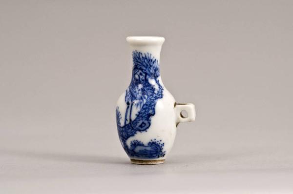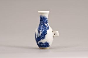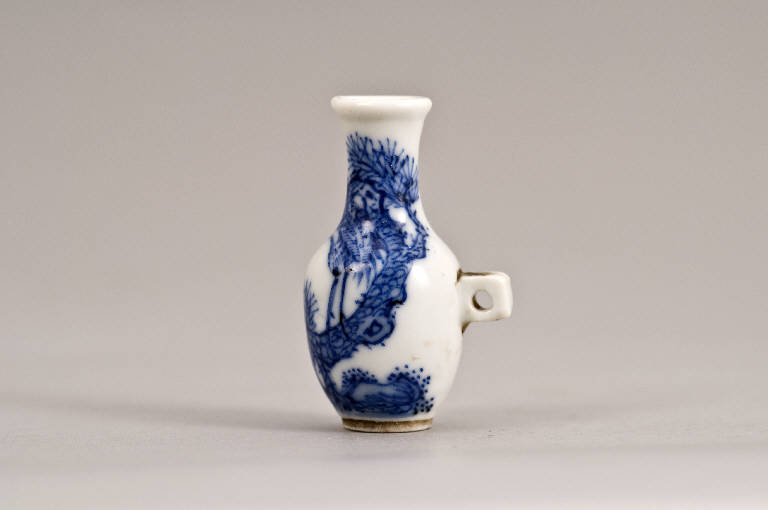 Vasetto in porcellana con spalla bombata, lungo collo cilindrico e ampia bocca leggermente estroflessa; la decorazione, dipinta in blu di cobalto al di sotto dell'invetriatura trasparente, mostra un albero di pino (matsu) sul tronco del quale sta posata una gru (tsuru), entrambi simboli di longevità.