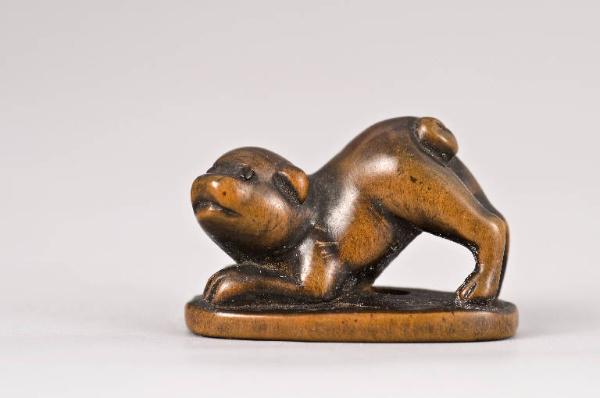 Netsuke raffigurante un cane (inu) su una bassa base di forma all'incirca ovale; l'animale si sporge in avanti con le zampe anteriori piegate e la testa leggermente inclinata verso sinistra; gli occhi sono minuti intarsi di corno.