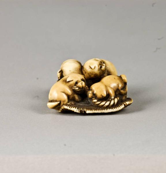 Il netsuke raffigura cinque cuccioli di cane (inu) che se ne stanno posati su due stuoie di paglia intrecciata; due di loro tengono tra le fauci due lembi di una stessa corda, mentre altri due giocano mettendosi l'uno sopra l'altro.