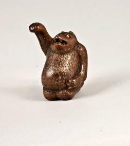 Netsuke raffigurante un tanuki con il braccio destro disteso e sollevato; gli occhi sono due intarsi di avorio.