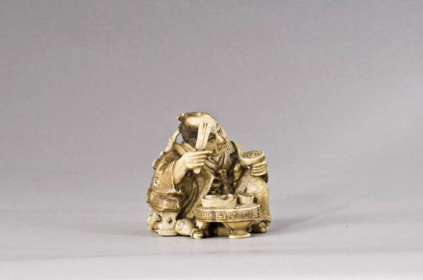 Questo piccolo netsuke-okimono raffigura un uomo seduto con il braccio destro posato su un basso sgabello; nella mano sinistra tiene una tazza riempita di sake, in quella destra un ventaglio chiuso con il quale si tocca il capo forse dolorante; ai suoi piedi è sistemato un basso tavolinetto sul quale sono posati un vassoio con un pesce e un'altra tazza; la bottiglia del vino liquoroso è riversa per terra, sulla destra dell'uomo.