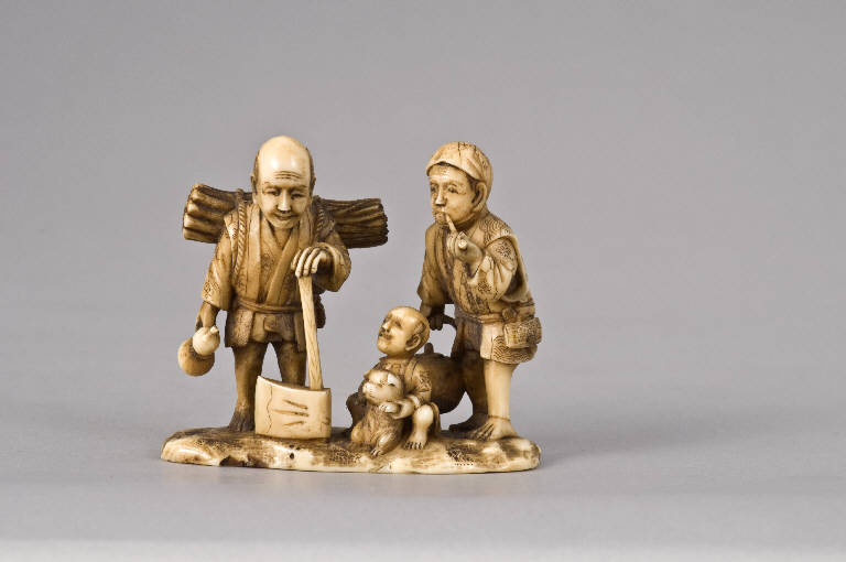 Okimono in avorio marino raffigurante una scena con due contadini, un bambino e un cane. L'uomo sulla sinistra posa il palmo della sua mano sinistra sul manico di un'ascia rivolta a terra, mentre nella mano destra tiene una fiasca a zucca; sulle spalle trasporta una fascina di legna. L'uomo sulla destra, invece, indossa una casacca decorata con motivi di onde stilizzate e uccelli, ha la pipa (kiseru) in bocca e alla fascia in vita tiene legata, tramite un netsuke di tipo manju, una borsa da tabacco (tabako-ire); nella mano destra tiene un grande versatoio con manico e coperchio. Infine, il bambino, seduto al centro della composizione tra i due uomini, è raffigurato mentre gioca con un cagnolino tenendolo sollevato dalle zampe anteriori.