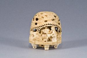 Netsuke-okimono raffigurante una composizione complessa, ambientata tra rocce taihu e sovrastata a calotta da un grande albero di pino (matsu); da un lato si vede una scena della quale fanno parte un uomo con ventaglio in mano e una donna intenta ad offrire una bevanda ad una tartaruga (kame); nell'altro lato, invece, il palcoscenico è occupato da due gru (tsuru) una di fronte all'altra, tra le quali si inserisce ancora una tartaruga.