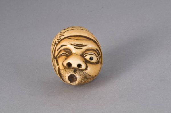 - NOTIZIE STORICO CRITICHE Una firma analoga, anch'essa racchiusa come quella di questo netsuke Lanfranchi all'interno di un cartiglio ogivale a contorno frastagliato, caratterizza una maschera illustrata dal Bushell (1985, p. 169, n. 176), il quale non fornisce però ulteriori informazioni su questo nestukeshi. Un'altra maschera del tutto affine a questa, anch'essa firmata Masakazu, è conservata presso il Museo dell'Hermitage di San Pietroburgo (Uspenskij 1994, p. 281, n. 364: la firma non è illustrata).