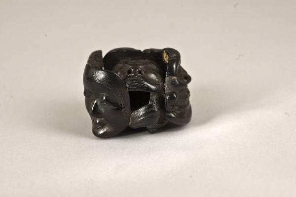 Netsuke in legno di ebano con un gruppo di sette maschere raffiguranti i Sette Dei della Fortuna (Shichifukujin).