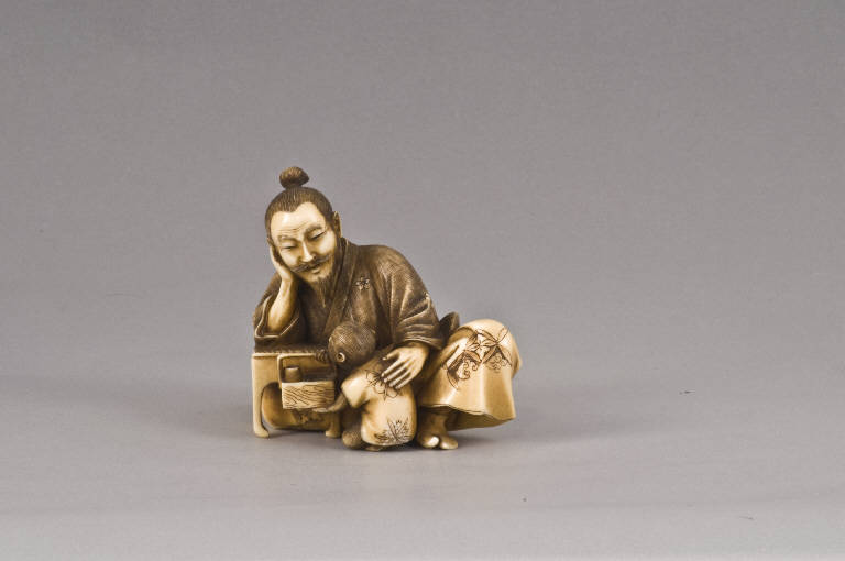 Okimono raffigurante un uomo con baffi, barba e cappelli lunghi legati in un codino; sta seduto, con il gomito del braccio destro posato su un basso tavolinetto e la mano sul volto; con la mano sinistra accarezza una piccola scimmietta vestita di una casacca smanicata, la quale gli porge un cesto con manico.