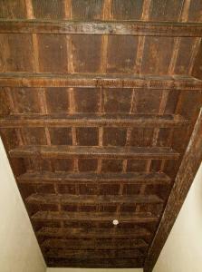 Soffitto a travi con decoro inciso e dipinto sia sulle travi sia sui regoli di chiusura tra le assi che compongono l'assito di chiusura.