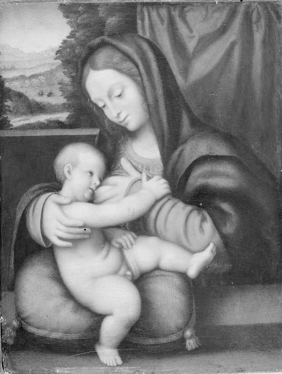 - NOTIZIE STORICO CRITICHE L'opera, di devozione privata, deriva in controparte dalla "Madonna che allatta Gesù Bambino" di Andrea Solario, conservata al Museo Poldi-Pezzoli di Milano (tempera su tavola, 1612/602).