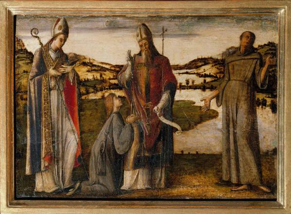 - NOTIZIE STORICO CRITICHE Opera per la devozione privata, incorniciata con listello ligneo dorato del XX secolo. Si tratta probabilmente di uno scomparto di predella di una ignota pala. La tavola è citata da G. Lochis nel 1858 che scrive: "Due santi vescovi, ed altro santo francescano con un devoto, e paese finitissimo". Fu attribuito per la prima volta ad Alvise da Angela Ottino Dalla Chiesa nel 1955.