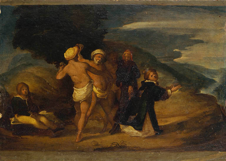 - NOTIZIE STORICO CRITICHE Opera sacra a destinazione pubblica. Si tratta della predella destra della Pala di Santo Stefano attribuita a G. F. Bembo detto Bembino. Le altre tavole raffigurano una Madonna con Bambino e Santo Stefano (Cremona, Museo Civico, num. inv. 1280), una Testa di Santo (Gazzada, Raccolta Cagnola), la Predica di Santo Stefano (Bergamo, Accademia Carrara, num. inv. 81LC00032) e l'Espulsione di Santo Stefano dalla sinagoga (Bergamo, Accademia Carrara, num. inv. 81LC00033). Il supporto è in legno d'abete. La provenienza della pala dalla chiesa conventuale di Santo Stefano a Bergamo e quindi dalla chiesa di San Bartolomeo, sostenuta dagli studiosi a partire da Corrado Ricci (1912), è stata definitivamente smentita da Franco Moro nel 1986.