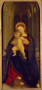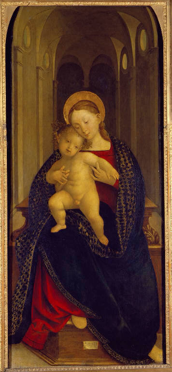 - NOTIZIE STORICO CRITICHE L'opera, sacra a destinazione pubblica, è inserita in una cornice non originale. Si tratta dello scomparto centrale del "Trittico della Madonna". Gli altri due scomparti sono: "San Michele Arcangelo, una Santa ed un devoto" (Bergamo, Accademia Carrara, num. inv. 81LC00160) e "Santa Lucia e San Domenico, ed una devota" (Bergamo, Accademia Carrara, num. inv. 81LC00160). Gli angoli superiori della tavola sono leggermente arcuati, forse in origine era centinata. Giovanna Brambilla Ranise in "La raccolta dimezzata. Storia della dispersione della pinacoteca di Guglielmo Lochis (1789-1859)" riferisce che il trittico pervenne a Lochis precedentemente al 1833.