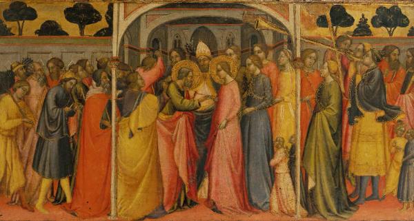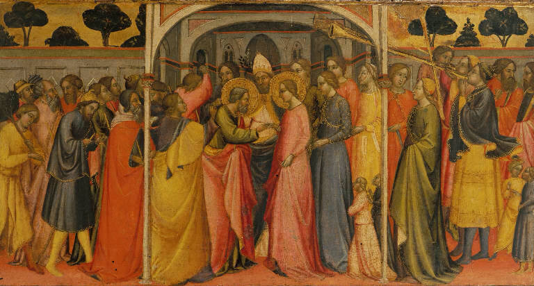 - NOTIZIE STORICO CRITICHE Si tratta di uno scomparto del "Polittico delle storie di Maria (?)" inserito in una cornice originale a listello ligneo rettangolare stondato ricoperta con oro in foglia. Gli altri scomparti sono: "Incontro alla Porta Aurea" (Milano, Collezione Mattioli), "Natività della Vergine" (Milano, Collezione Mattioli) e "Presentazione di Maria al tempio" (Milano, Collezione Mattioli). L'opera è citata nel 1858 da G. Lochis che scrive: "Bellissimo dipinto, attribuito dai più a Mazzolino da Panicale". Il supporto è in legno d'abete. L'attribuzione al Maestro di Santa Verdiana fu avanzata da M. Boskovits, 1967.