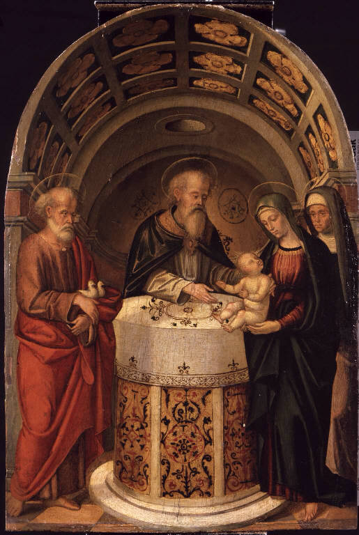 - NOTIZIE STORICO CRITICHE Opera sacra a destinazione privata. La tavola in origine aveva forma ovale. Affinità con la tavola di galeazzo Campi con la "Presentazione di Gesù al tempio" conservata alla Gemaldegalerie der Akademie di Vienna.