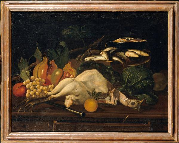 - NOTIZIE STORICO CRITICHE Il dipinto, con il suo pendant (inv. 06AC00938), si ispira direttamente a una nota "Cucina" di Baschenis, di cui si conoscono almeno tre varianti in collezioni private bergamasche. La tela in esame replica in particolare, con esattezza ma in diversa collocazione, i temi del cassettone, del pollo spennato in primo piano e dei pesci in secondo piano, mentre sono motivi originali la frutta e i cavoli.