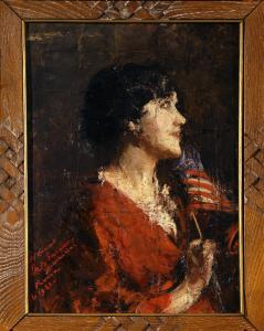 Ritratto di Maria Sangiovanni con la bandiera degli Stati Uniti d'America