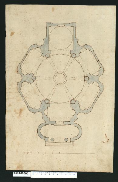 - NOTIZIE STORICO CRITICHE Nell'"Indice" del tomo nel quale era rilegato il disegno viene definito: "D.a di Chiesa sesagona" (leggi: "Pianta di Chiesa sesagona").\nIl disegno che non è stato possibile identificare raffigura una chiesa a pianta esagonale regolare a cupola centrale, con cinque cappelle radiali a pianta rettangolare con nicchie ricavate nello spessore dei muri laterali. Lo schema centralizzato risulta però allungato in senso longitudinale dall'inserimento in facciata di un portico su colonne con pareti laterali a terminazione absidale cui fa da contrappunto, sul lato opposto, il presbiterio a pianta quadrata coperto a cupola. L'articolazione parietale interna è definita dalla sequenza di sei colonne addossate per tre quarti nello smusso dei pilastri. In corrispondenza di questi elementi portanti, lungo il perimetro esterno sono ricavate profonde nicchie.