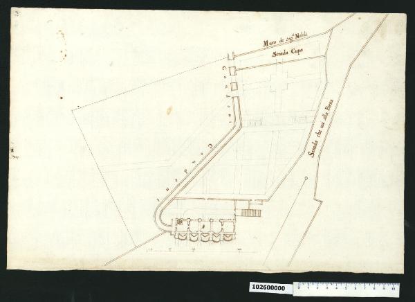 - NOTIZIE STORICO CRITICHE Nell'"Indice" del tomo nel quale era rilegato il disegno viene definito: "D.a di parte di Casa" (leggi: "Pianta di parte di Casa").\nLe indicazioni topografiche riportate sul disegno consentono l'individuazione dell'area all'interno della città di Roma. La "strada cupa" confina con la "vigna della signora Clarice dè Nobili situata alle radici di S. Pietro in Montorio, in una stratta ripiena di fienili, chiamata strata cupa" (U. Gnoli, 1939, p. 91), di conseguenza, l'edificio raffigurato è quello della fontana dell'Acqua Paola. Nel primo anno del suo pontificato Paolo V avviò il progetto di ricostruzione dell'antico acquedotto dell'Acqua Traiana che dal lago di Bracciano trasportava l'acqua in città e riforniva Trastevere, l'area attorno a via Giulia e il Vaticano. Per celebrare ed enfatizzare questo avvenimento fu costruita tra il 1608 e il 1612 una grande fontana sul Granicolo, su progetto di Flaminio Ponzio. Il disegno dell'Acqua Paola era tradizionalmente attribuito a Carlo Maderno, ma Cesare d'Onofrio (Le fontane di Roma, Roma 1957) ha dimostrato che con ogni probabilità Flaminio Ponzio, architetto del papa Scipione Borghese, ne fu l'autore. L' attribuzione a Flaminio Ponzio può essere ulteriormente confermata da quanto riportato da G.B. Mola, allievo di Ponzio, nella sua descrizione delle architettura di Roma del 1663 (Roma l'Anno 1663 di GB Mola, a cura di K. Noehles, Berlino 1966, p. 131). Il Mola non menziona Carlo Maderno, quando si tratta dell'Acqua Paola, ma scrive: 'La Fontana di Ponte Sisto e S. Pietro Montorio è disegno Flaminio Ponzi et Gio. Fontana". Inoltre, il 22 settembre 1611 il Commendatore della Banca di S. Spirito riceveva un ordine per un incarico concernente il trasporto dell'ultimo marmo per la costruzione della "Mostra dell'Acqua Paola" firmato da Flaminio Ponzio "architetto" (Helmann 1970, p. 656 n. 6). Il disegno in esame mostra l'impianto prima delle trasformazioni apportate da Carlo Fontana nel 1690, consistenti nella creazione del grande bacino d'acqua semicircolare che ancora oggi si vede. In origine invece, l'acqua si riversava in cinque vasche di granito poste tra gli intercolumni degli archi. Mentre le campate laterali hanno la parete retrostante completamente chiusa, in ciascuno dei tre archi centrali si apre una finestra, quella centrale successivamente aperta dal Carlo Fontana. Alle spalle delle vasche si trovano tre ambienti: un'ampia loggia aperta verso il giardini e due sale laterali (quella a sud dotata di scala a chiocciola che porta al tetto) illuminate da una finestra. Il disegno riporta anche il tracciato dei condotti dell'acquedotto.