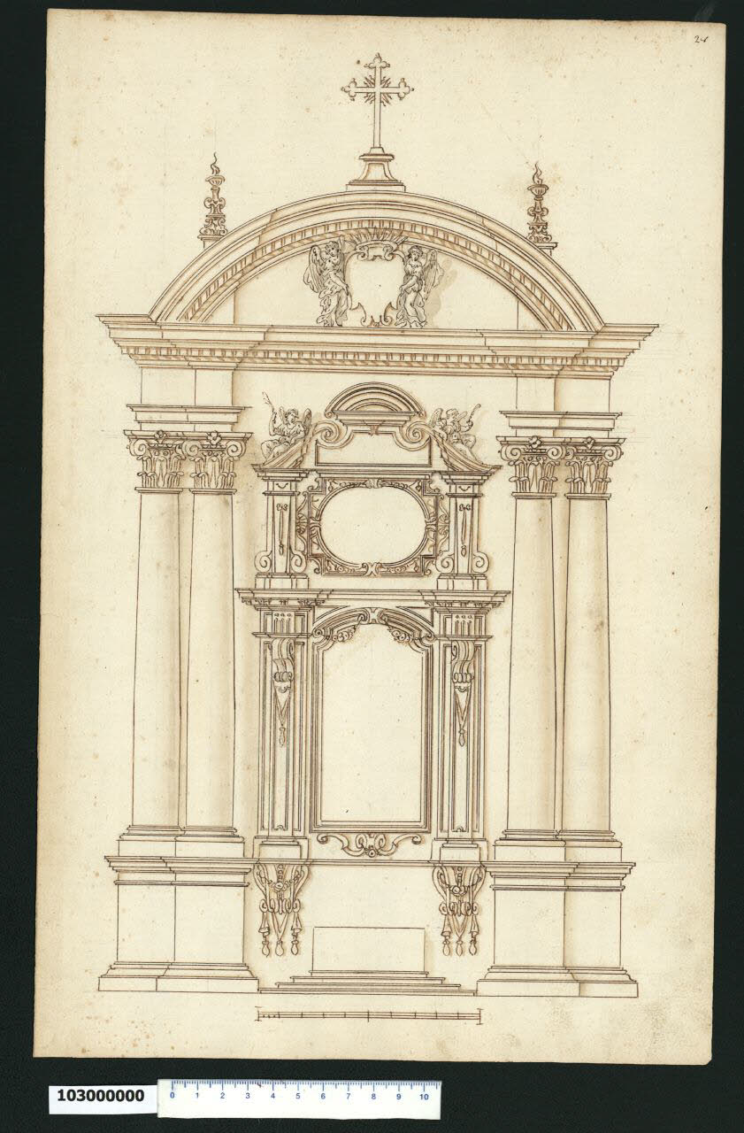 - NOTIZIE STORICO CRITICHE Nell'"Indice" del tomo nel quale era rilegato il disegno viene definito: "D.o d'ingresso di cappella" (leggi: "Prospetto d'ingresso di cappella").\nIl disegno che non è stato possibile identificare raffigura il prospetto di un altare. Una struttura composta da coppie di colonne corinzie impostate su alti piedistalli, che reggono un timpano curvilineo ornato con due angeli che reggono uno scudo, inquadra la mensa e la pala dell'altare. Quest'ultima è inserita all'interno di una composizione a edicola, formata da paraste rette e ornate da mensole, che reggono un attico con cartella ovale al centro. L'attico è delimitato lateralmente da corte paraste che reggono il timpano mistilineo composto da una parte centrale curvilinea e due volute laterali sopra le quali sono adagiati due angeli (analoga soluzione è riscontrabile nei disegni in Milano, Collezione Sardini Martinelli inv. 1,35; 1,46).