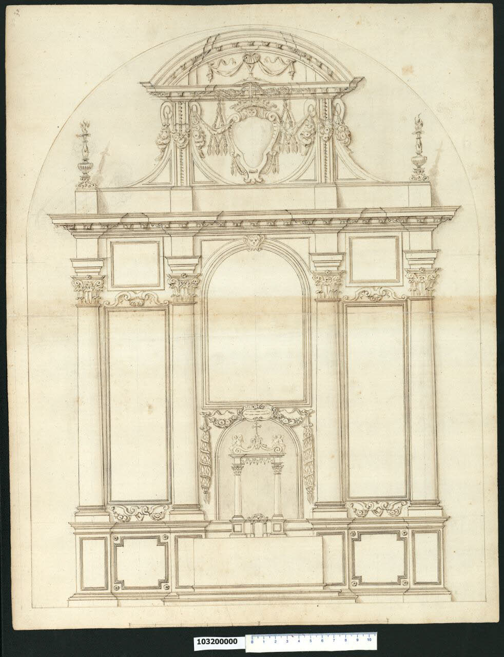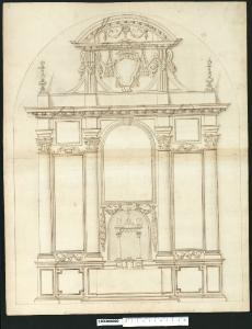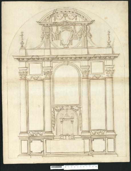 - NOTIZIE STORICO CRITICHE Nell'"Indice" del tomo nel quale era rilegato il disegno viene definito: "Altar maggiore".\nIl disegno che non è stato possibile identificare raffigura il prospetto di un altare. Sopra un alto zoccolo ornato da semplici specchiature si imposta una composizione articolata in tre campate da colonne di ordine corinzio reggenti dadi di trabeazione uniti da una cornice continua sorretta da mensoline. In corrispondenza della campata centrale si innalza un attico che ospita al centro uno stemma cardinalizio; quest'ultimo si sovrappone parzialmente con la cornice inferiore del timpano curvilineo soprastante. Alle spalle del tabernacolo posta sopra la mensa è collocata la pala d'altare centinata circondata da ghirlande e con cartiglio in chiave di volta. Alcune soluzioni grafiche ed elementi decorativi tipici del repertorio formale di Giovanni Battista Gisleni, fanno ipotizzare che l'artista sia autore anche del presente disegno.