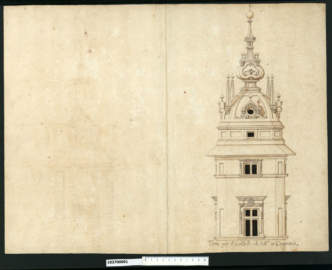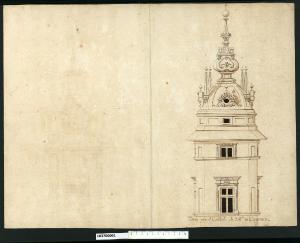 - NOTIZIE STORICO CRITICHE Nell'"Indice" del tomo nel quale era rilegato il disegno viene definito: "Torre per il Castello di S.M.a in Cracovia".\nIl disegno si riferisce ad un progetto di Giovanni Battista Gisleni per la porzione terminale della torre di Sigismondo III (re della Polonia dal 1587 al 1632) nel castello di Wawel a Cracovia.\nAd un primo livello con finestra crociata al centro della parete, inquadrata da una cornice dal profilo fortemente modanato, con stemma al centro della trabeazione, segue un piano mezzanino anch'esso con finestra. La parte terminale è costituita da una piccola cupola con oculi e obelischi sulla quale campeggia il coronamento a bulbo cuspidato.
