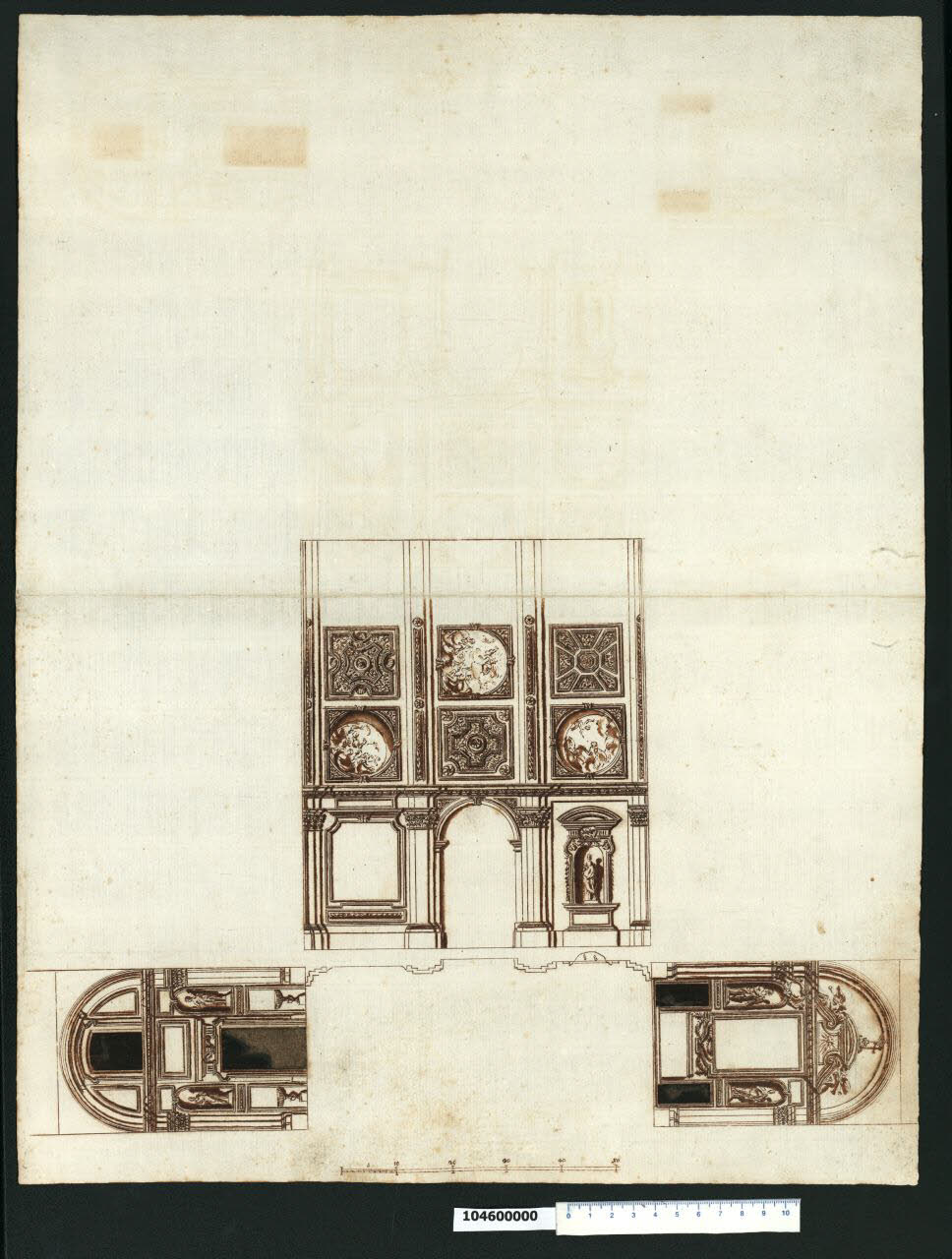 - NOTIZIE STORICO CRITICHE Nell'"Indice" del tomo nel quale era rilegato il disegno viene definito: "Spaccati di cappella".\nIl disegno che non è stato possibile identificare raffigura tre prospetti interni e la pianta parziale di un'architettura che potrebbe essere una cappella, anche se la presenza di una porta fiancheggiata da acquasantiere, aperta quindi verso un "esterno", lascia dubbi su questa destinazione d'uso. Un ordine di paraste corinzie suddivide la parete più lunga in tre campate, quella centrale ospita una sfondato ad arco a tutto sesto, le due laterali presentano una nicchia ornata da statua (a destra) e una specchiatura (a sinistra). Sopra la trabeazione si sviluppa la volta a botte con cassettoni decorati con elaborati intagli, alternati ad altri che presentano al centro degli oculi prospettici dipinti con scene religiose. La parete più corta a sinistra mostra un portale trabeato fiancheggiato da setti murari, delimitati da lesene ribattute su piedistallo, che ospitano acquasantiere sormontate da nicchie ornate da statue. In asse con il portale, nello spazio compreso tra la cornice della trabeazione e la ghiera dell'arco è collocata una finestra. Al centro della parete opposta è collocato l'altare ai cui lati si aprono due porte sormontate da nicchie con statue. La cornice della trabeazione funge anche da limite superiore della pala d'altare e da base per il timpano mistilineo composto da due volute laterali con angeli adagiati, che reggono la porzione semicircolare. Analoga soluzione è presente nei disegni in Milano, Collezione Sardini Martinelli inv. 1,30; 1,35 e, come per questi, anche nel presente foglio, alcune soluzioni grafiche ed elementi decorativi tipici del repertorio formale di Giovanni Battista Gisleni, fanno ipotizzare che l'artista ne sia l'autore.